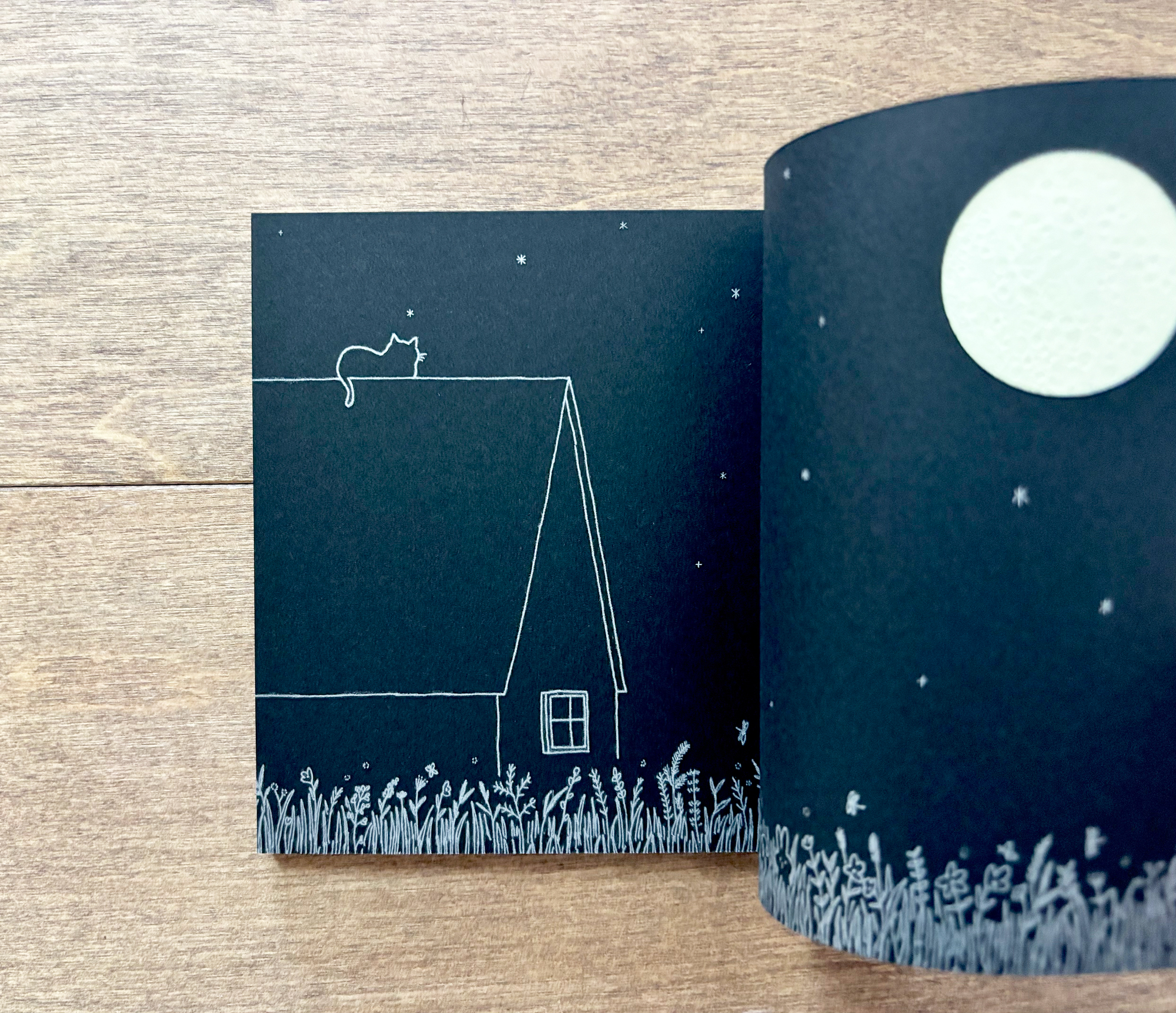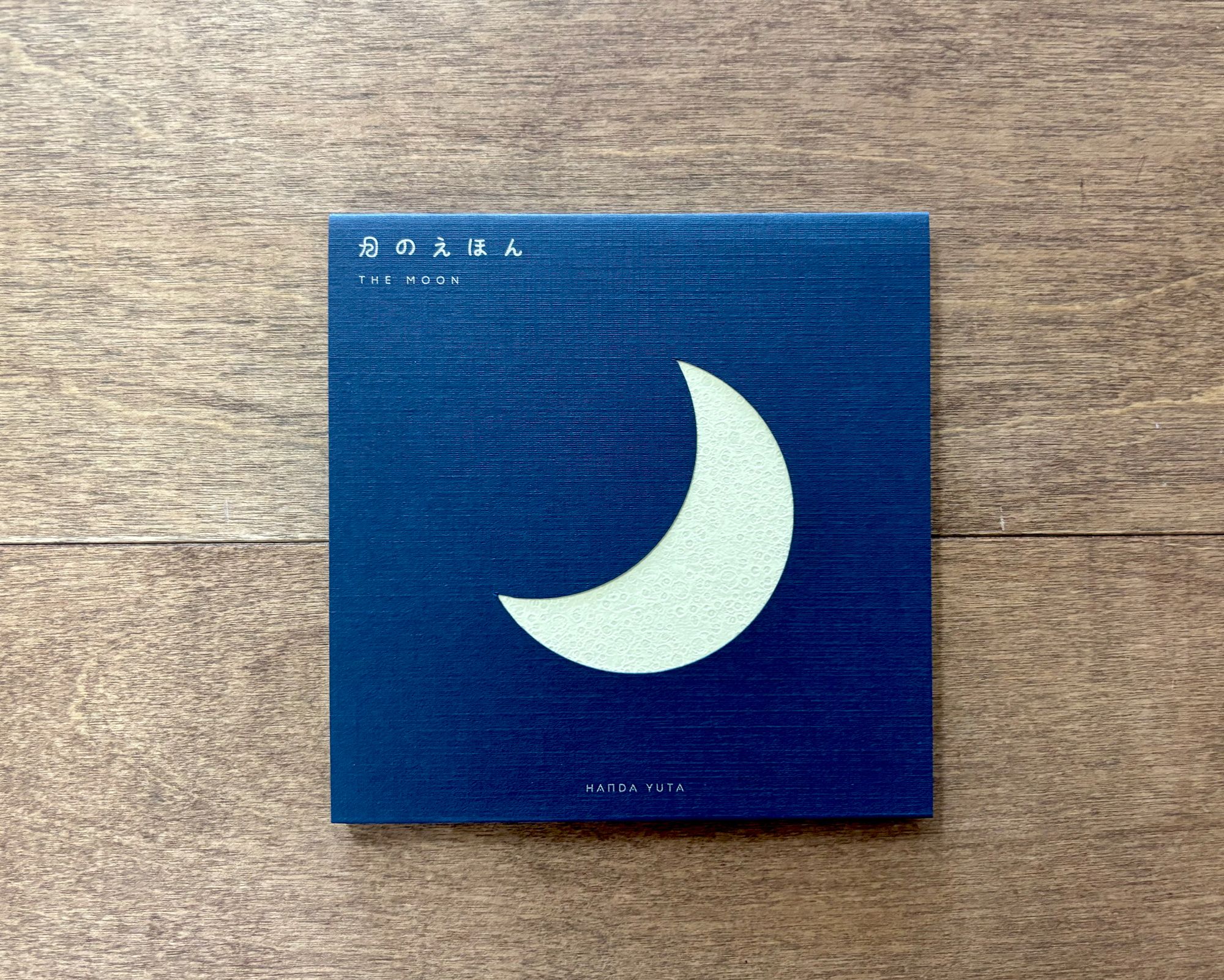 130mm正方形の小さな絵本ながら、スリーブ(箱)入り。表紙には月を模したデザインでスリーブに入れた状態では三日月、出すと満月が現れる仕様になっています。